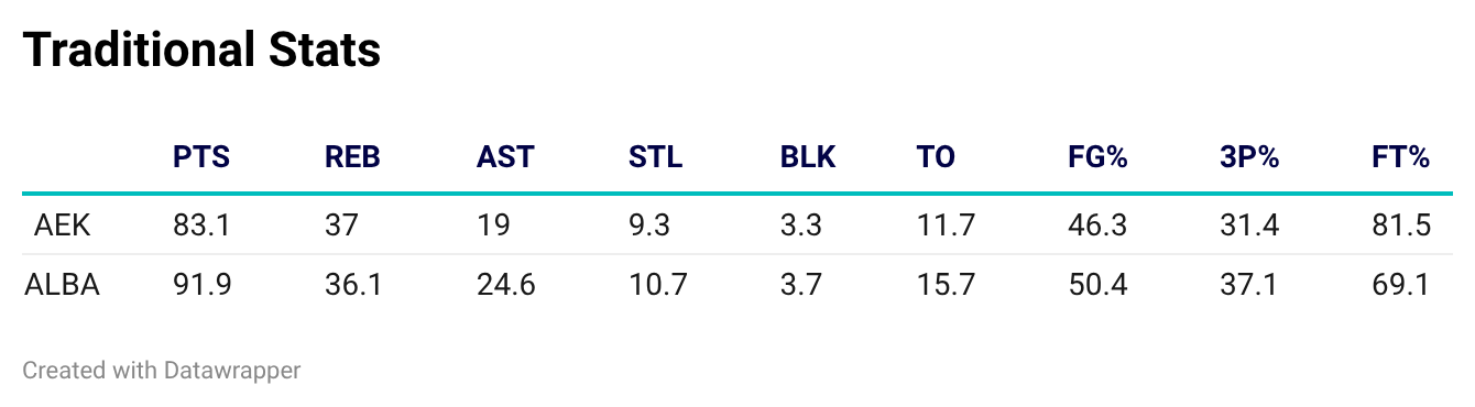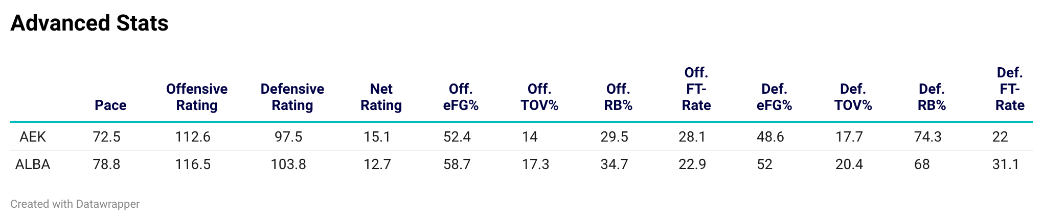 AEK stellt mit einem Defensive Rating von 97,5 die beste Verteidigung der gesamten BCL. Die Griechen sind Meister darin, den Gegner zu Fehlwürfen zu zwingen, was sich in einer gegnerischen effektiven Feldwurfquote von nur 48,6 % (3.) zeigt. ALBA hingegen diktiert mit einer Pace von 78,8 das höchste Tempo und führt die Liga bei den Vorlagen (24,6, 1.) an. AEK bevorzugt ein deutlich langsameres Spiel (Pace: 72,5, 24.). Die Albatrosse treffen überragende 50,4 % ihrer Feldwürfe (2.), leisten sich aber auch 15,7 Ballverluste (28.). AEK ist hier deutlich disziplinierter und verliert den Ball nur 11,7-mal pro Spiel (9.). Ein Vorteil für AEK liegt an der Freiwurflinie. Die Griechen treffen exzellente 81,5 % ihrer Freiwürfe (3.), während ALBA hier mit 69,1 % (25.) eine ihrer größten Schwachstellen offenbart.