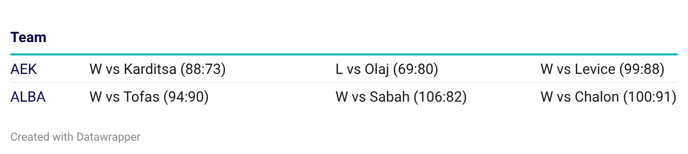 Dieses Aufeinandertreffen markiert das erste offizielle Duell zwischen AEK und ALBA in der BCL. Insgesamt steht ALBA bei einer Bilanz von 3:3 gegen AEK. Zuletzt traf man in der Saison 2002/03 in der EuroLeague aufeinander, ALBA gewann beide Spiele (AEK - ALBA 87:88, ALBA - AEK 80:76).
