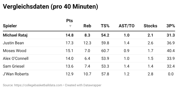 Mit 14,8 Punkten und 8,3 Rebounds liegt Rataj in beiden Kategorien im Mittelfeld der Vergleichsgruppe. Hierbei reiht er sich bei den Punkten hinter Justin Bean (17,3) und Moses Wood (15,1) und bei den Rebounds hinter Bean (12,3) und J'Wan Roberts (10,7) ein. Mit 2,1 Stocks zeigt Rataj eine solide defensive Präsenz und wird auch hier Dritter hinter Roberts (2,8) und Bean (2,6).